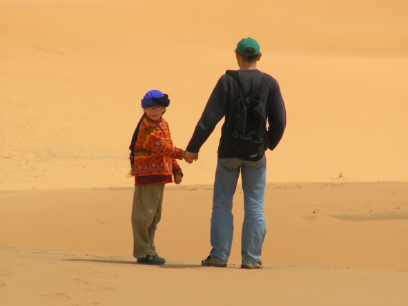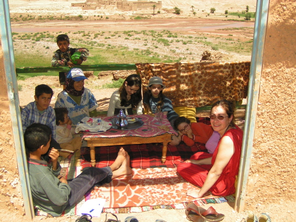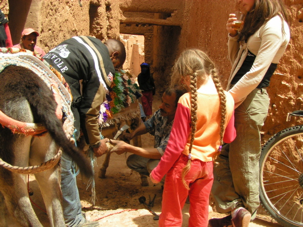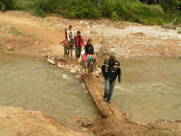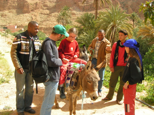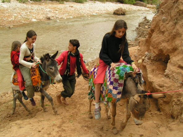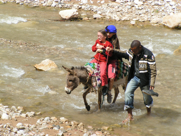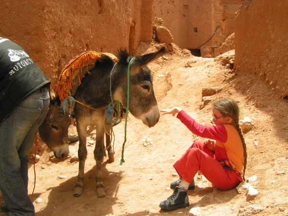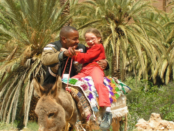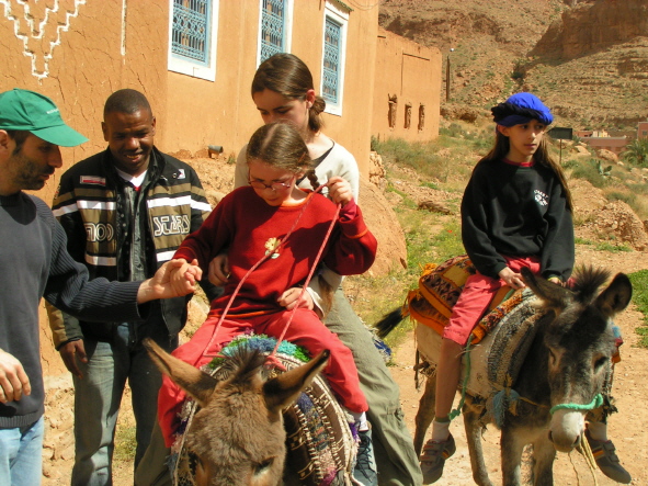 Zaineb et CamilleChez ZainebBalade en âne – Le départ !Le départ toujours…Loin d’être rassuréeet les traversées de rivière n’arrangent rien…Finalement, derrière Chloé, tout va bien, j’ai trouvé mon rythme.Je me cramponne toujours.Arrêt chez le maréchal-ferrantIdemPlus aucune appréhension.Toute petite devant Bab el Mansour à Meknèset sur les dunes de l’erg Chebbi à Merzougaça souffle !Rencontre avec Mohammed et sa famille non loin d’Aït BennadhouBalade en 4×4 dans les gorges du Todra et du Dadès