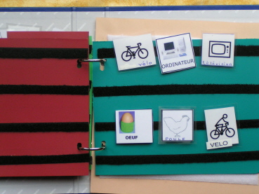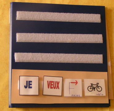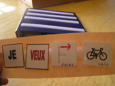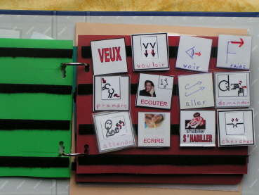 Un classeur de type PECS est à la disposition de Camille. Elle utilise ainsi la « bande phrase » pour nous dire ce qu’elle veut en allant piocher les mots « Je » et « Veux » suivis du ou des pictos correspondant à sa demande. Il s’en sert aussi en séances de travail avec l’éducatrice afin d’apprendre à visualiser les mots, puis les phrases.
