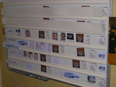 Voici l’emploi du temps, accompagné de son stock de pictos/mots/photos que nous avons fabriqué afin d’aider Camille à se repérer dans le temps, à anticiper les évènements, à réduire son angoisse face à l’incompréhension de son environnement.