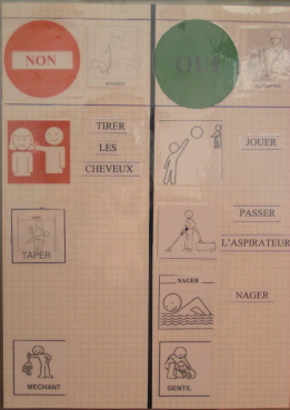 Nous avons également affiché une feuille bien visible de choses interdites/autorisées (composée de pictos/mots/signes/couleurs) à laquelle nous faisons référence régulièrement pour que Camille n’oublie pas par exemple que le chat n’apprécie pas qu’on lui tire la queue…